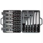 Includes 6pc 7-5/8 forks 6pc 8-3/4 steak knives 8-3/8 chef knife 8 tomato knife 4-1/2 boning knife 4-5/8 utility knife 3 paring knife and 11-3/4 sharpening steel. All store in a 14-1/8 x 10-1/4 x 1-3/4 blow-molded case. Limited time warranty. 83.00 Open Stock Value. Gift boxed.